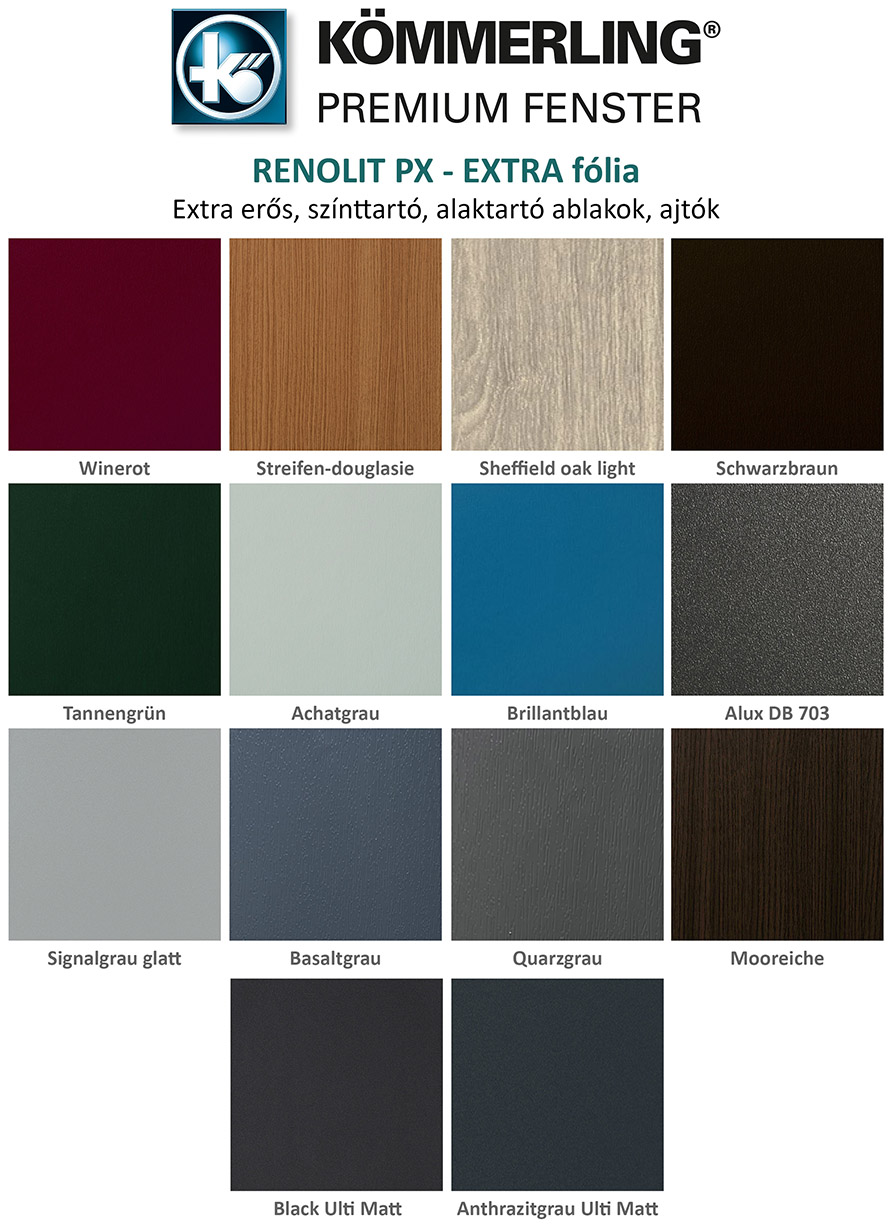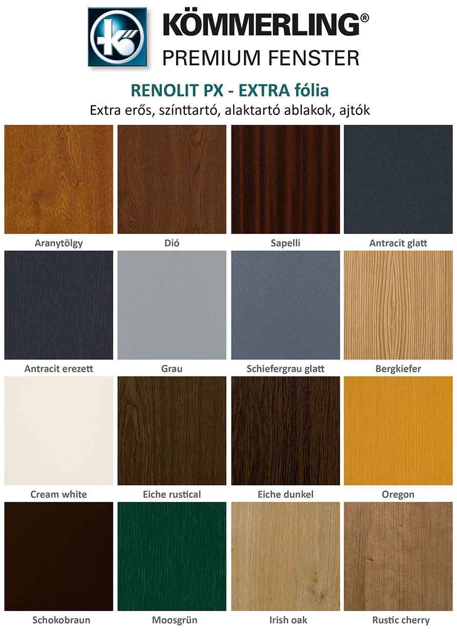 Nagyon sok színlehetőség áll rendelkezésedre. Nem szeretném nagyon ragozni ezt, mert a saját igényedhez igazítod majd a műanyag ablak rendelésedet. Ami neked tetszik és amit rá tudsz szánni összeget, azt kell megvásárolnod. Lent megtalálod a Kömmerling által használt PX renolit színeket. Válogass kedved szerint a színekből és kérj ajánlatot tőlem.
